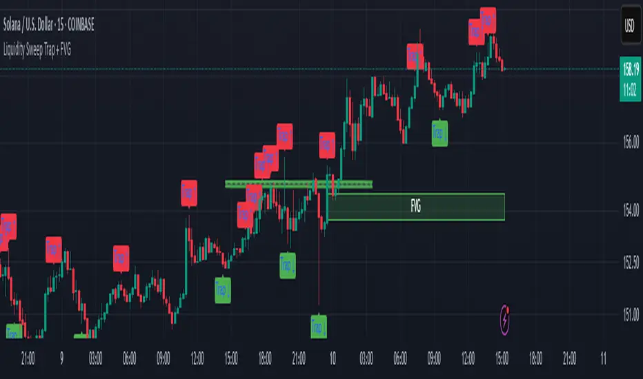 Detects high-conviction “liquidity sweep” traps (false breakouts) by comparing price against recent swing highs/lows, applying a wick-size filter and a cooldown period so that only meaningful reversal wicks trigger signals.