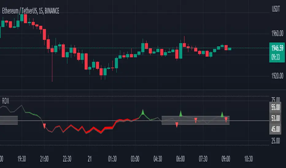 RDX Relative Directional Index, Strength + Direction + Trend. This indicator is the combination of RSI and DMI or ADX. RDX aims at providing Relative direction of the price along with strength of the trend. This acts as both RSI and Average Directional Index. as the strength grows the RSI line becomes wider and when there is high volatility and market fluctuation the line becomes thinner. Color decides the Direction. This indicator provides sideways detection of RSI signal.