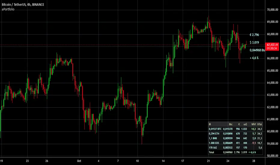aPortfolio can be overlayed on any chart with any timeframe. It provides a way to keep track of your portfolio(s) real-time and dynamically. Tool tips provide information about each input item.Up to 8 customizable assets can be defined using 2 exchanges. The amount owned, the exchange used and the amount spent (in Euro or US Dollar) can be entered per asset.
