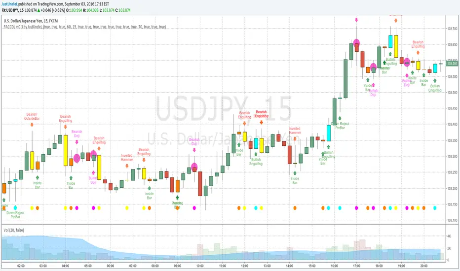 This requested release includes an Alert condition, so an alarm can be created on selected Price Action bars. Also this version modifies the Doji calculation to be similar to an Harami, so now the description of the Doji's are: