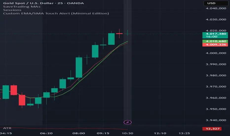 This Pine Script for TradingView is designed to help traders catch important short-term market touches on moving averages. It monitors both EMA (Exponential Moving Average) and SMA (Simple Moving Average) with fully customizable periods.Whether you are scalping, day trading, or monitoring pullbacks, this script notifies you when the price touches your selected EMA or SMA, giving you a timely opportunity to analyze or enter trades.