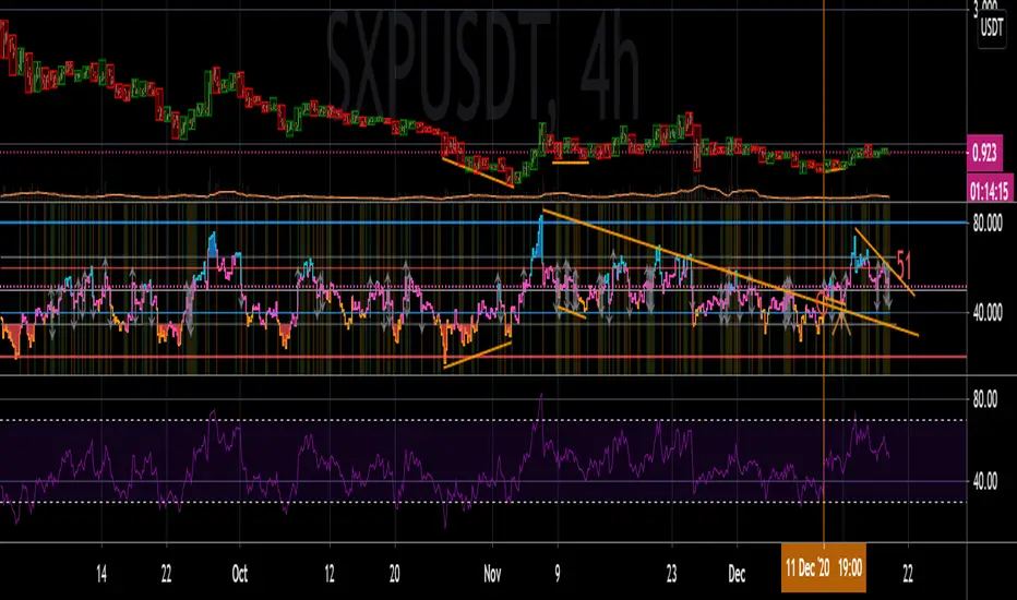 In the chart above, I marked up the RSI and candles with trend-lines to show that the stylized plotted stepline in technicolor is still just the RSI. Trend-lines, divergences, and other ways to trade the RSI are still entirely the same. The original RSI is included below mine so that these changes can be easily observed.