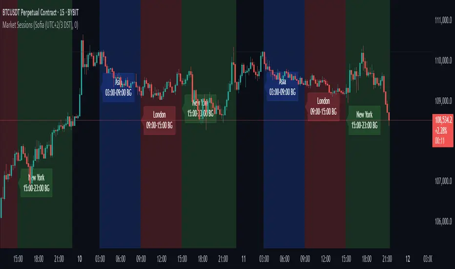 Този индикатор визуализира трите основни търговски сесии – Азия, Лондон и Ню Йорк – чрез оцветяване на графиката и поставяне на етикети. Работи с всякакви активи (FOREX, крипто, метали и др.), защото всички изчисления се правят спрямо UTC и после се адаптират към избраната часова зона.