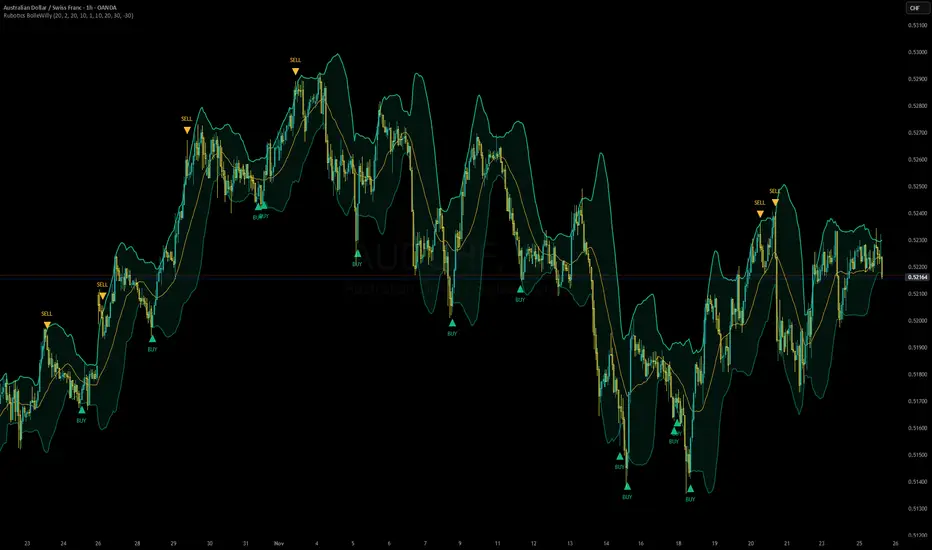 This closed-source system fuses volatility expansion, band-reversion patterns, and Williams %R momentum shifts into a unified signal engine. Instead of merely combining common indicators, the BolleWilly model creates a custom interaction between Bollinger Band pressure and momentum exhaustion, allowing traders to identify potential reversal points directly on the price chart.