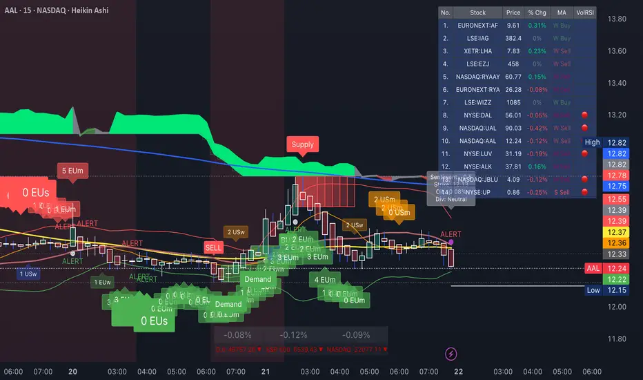 Basket MA Lines: Overlaid on Price (Green for EU, Blue for US Total MAs). Basket Signals: Below/Above Bars with Labels (EUs/USs, etc.) indicating MA cross strength. Sentiment Plot: User-defined Anchor line with a superimposed line colored Lime (Bullish) or Red (Bearish) representing the Combined Sentiment Index. Strike Price Line: Overlaid on Price as a Solid White line, an estimated near-term target price projected from the sentiment strength. Indices Table: Located at the Bottom Center, displaying real-time percentage change and alerts for the major US stock indices. Oil Inflection: Overlaid on Price as Thick Yellow/Blue Lines highlighting bars where the oil/airline relationship is confirmed or broken.