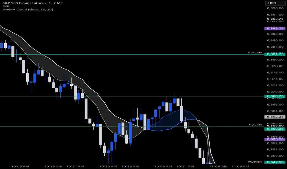 A volume-weighted moving average (VWMA) cloud consisting of fast and slow VWMAs. The lines are dynamically colored based on their relative positions, forming a visual cloud that highlights bullish and bearish trends.