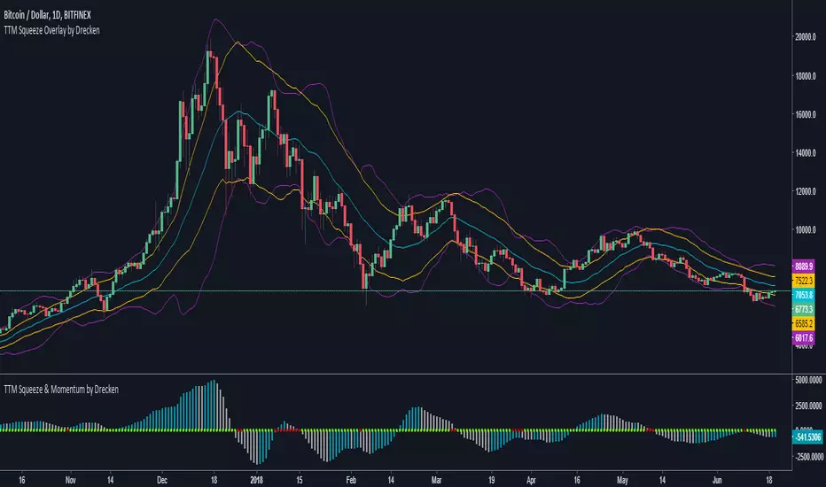 TTM Squeeze Overlay shows Bollinger Bands and Keltner Channels. When the Bollinger Bands (purple) go inside of the Keltner Channel (yellow), the market is said to be in a squeeze.