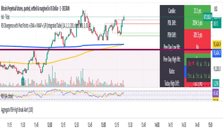 The “Aggregate PDH High Break Alert” is a lightweight Pine Script v6 indicator designed to instantly notify you when today’s price breaks above any prior-day high in a user-defined lookback window. Instead of manually scanning dozens of daily highs, this script automatically loops through the last _N_ days (up to 100) and fires a single-bar alert the moment price eclipses a specific day’s high.