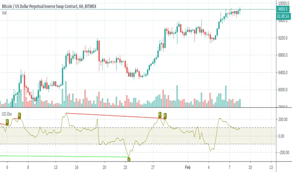 Regular bear divergence marked in R tag above the CCI line, hidden bear divergence marked in a H tag above the CCI line, regular bull divergence marked in a R tag below the CCI line, and hidden bull divergence marked in a H tag below the CCI line.