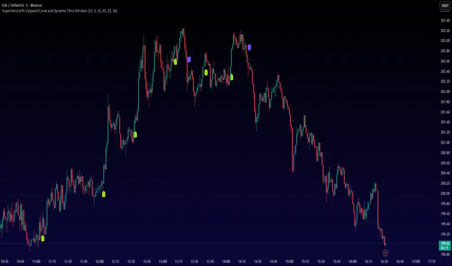 This indicator combines the **Supertrend** trend-following system with the **Coppock Curve** momentum oscillator to generate high-probability buy and sell signals. An additional **dynamic time window filter** ensures trades only occur during your specified trading hours, making it ideal for intraday traders who want to avoid low-liquidity periods.
