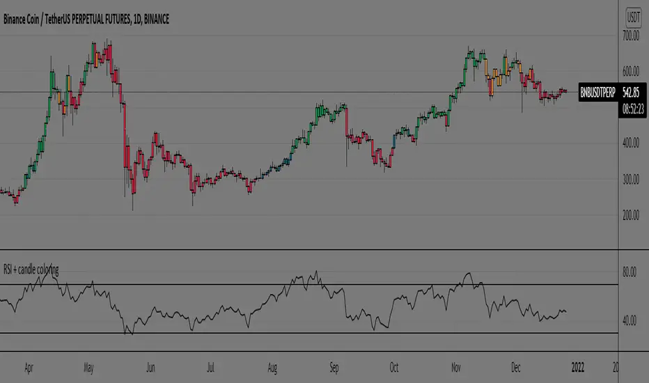 >In this script I have used the standard 14 period RSI and added candle coloring feature, I used two other periods other than 14 to determine the major trend and use the position of 14 period RSI relative to other 2 periods to color the candle.
