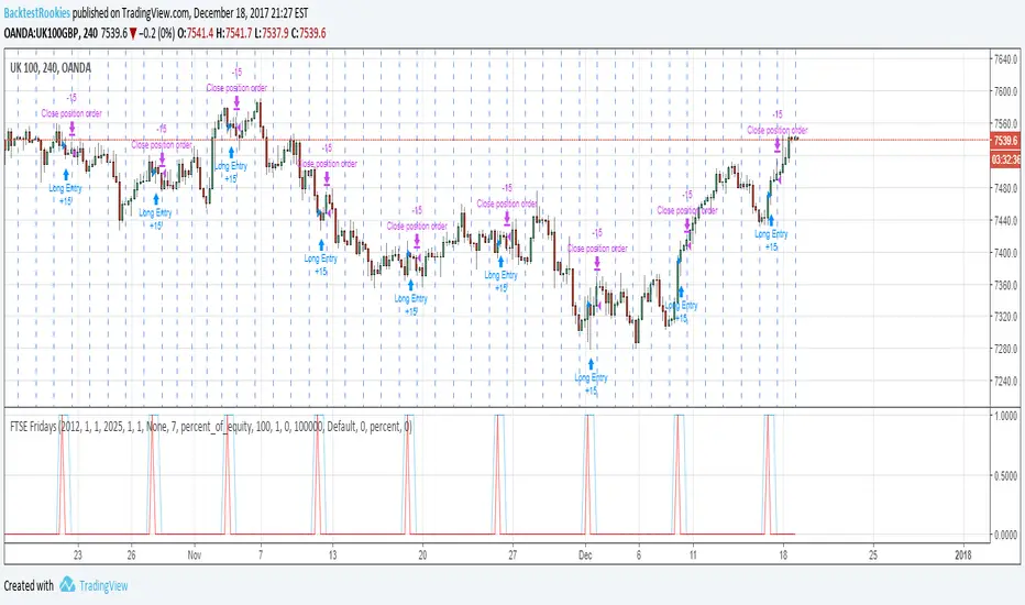 This code snippet below is a quick and dirty follow up to some statistical analysis performed on the FTSE 100. It showed that over the long run, (since 1995) going long on a Friday appeared to have a statistical edge (53%). As a bit of fun, I wanted to create a quick pine script backtest to test this and see if it is possible to profit from it. After all, the index might finish up 53% of the time, but that doesn't mean one can profit from it.
