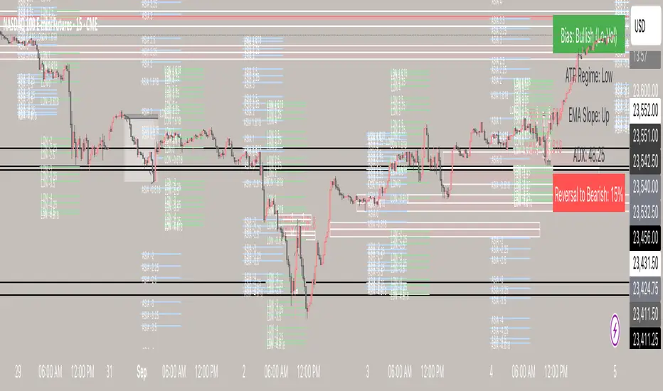 ⚡ Bottom line: The Session Fibs + Regime indicator doesn’t just give you levels — it gives you market context. It’s both a map of high-value price zones and a real-time bias filter that adapts as conditions change.