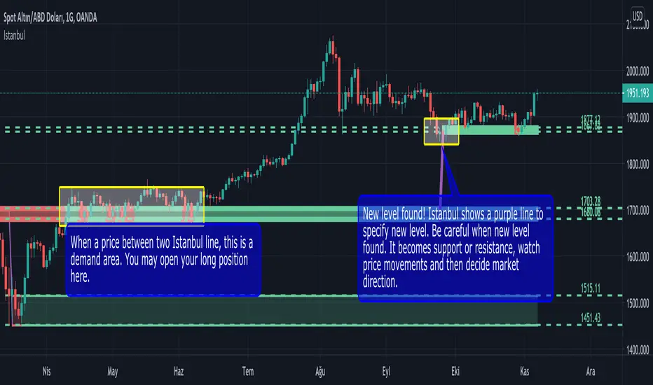 I'm proud of to introducing Istanbul indicator. Istanbul is a smart support/resistance indicator based on price action. It analyzes price with different lengths and decide where is the high volume and reversal pattern.