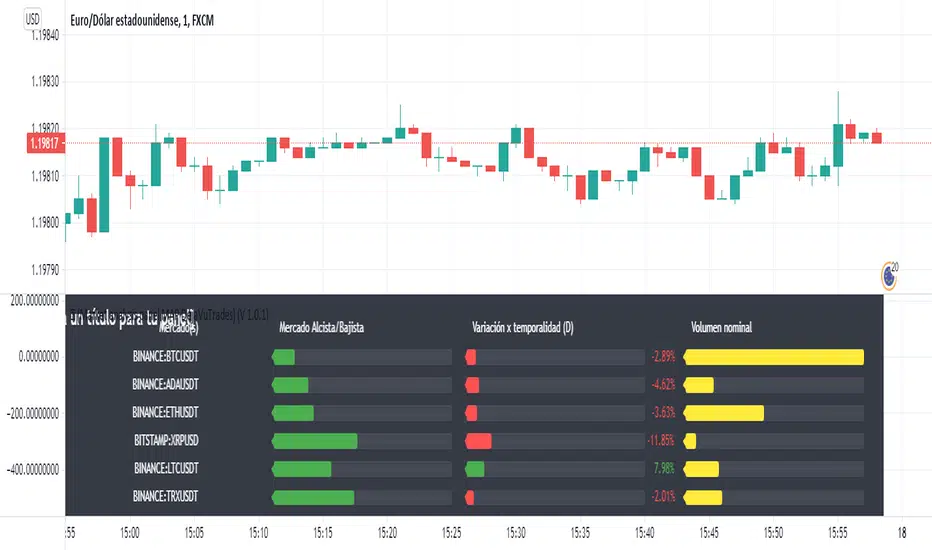 ►Variation by temporality: Current relationship with the close of the previous candle, depending on the selected temporality. indicating you in a green progress bar when the variation is positive, and red when the variation is negative, with their respective percentage.