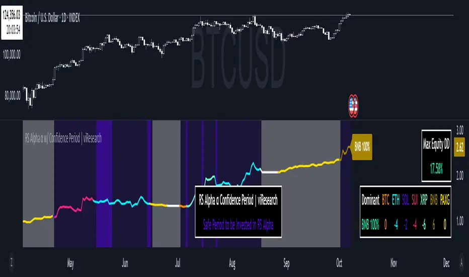 The RS Alpha α w/ Confidence Period | viResearch indicator represents a sophisticated evolution of relative strength analysis — combining alpha–beta decomposition, multi-asset momentum ranking, and dynamic confidence filtering to provide a structured, risk-aware framework for crypto asset rotation.