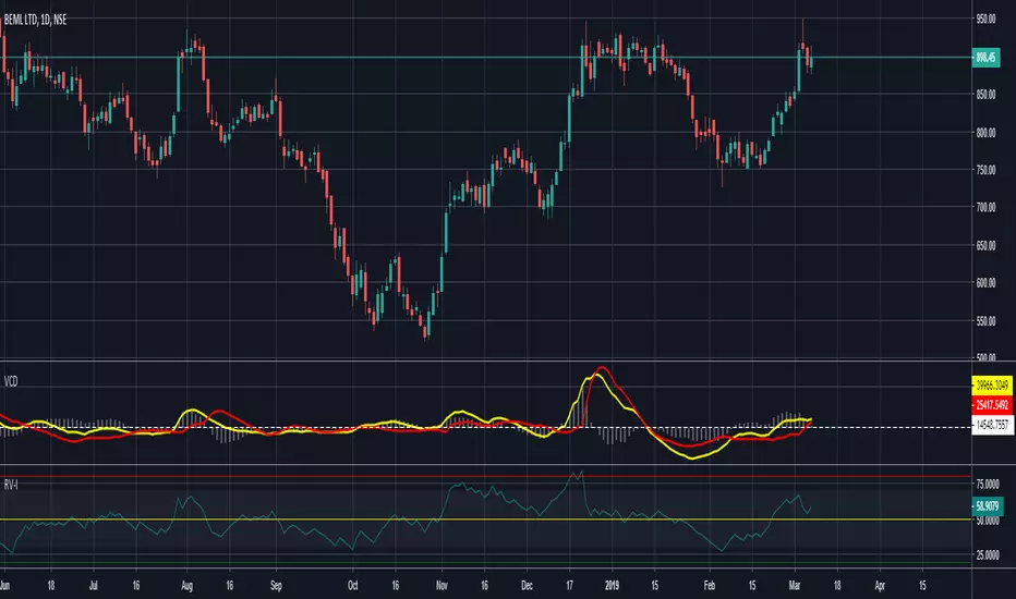 The indicator is MACD(14,9) of 14 day average of total positive and negative volume. The signals are not to be studied similar to price MACD(buy and sell based on line-crossover); instead it shows the overall buyer and seller sentiments.