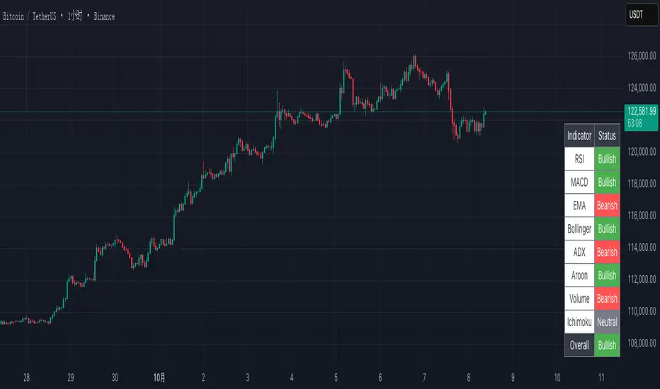 The Trend Dashboard is a custom TradingView Pine Script v5 indicator designed to provide a comprehensive analysis of Bitcoin (BTCUSD) market trends across multiple timeframes. It evaluates eight popular technical indicators—RSI, MACD, EMA, Bollinger Bands, ADX, Aroon, Volume, and Ichimoku Cloud—and displays their bullish, bearish, or neutral status in a clear, color-coded table in the bottom-right corner of the chart. Additionally, it calculates an overall trend assessment based on the collective signals of these indicators, making it a valuable tool for traders seeking a quick, at-a-glance view of market conditions.