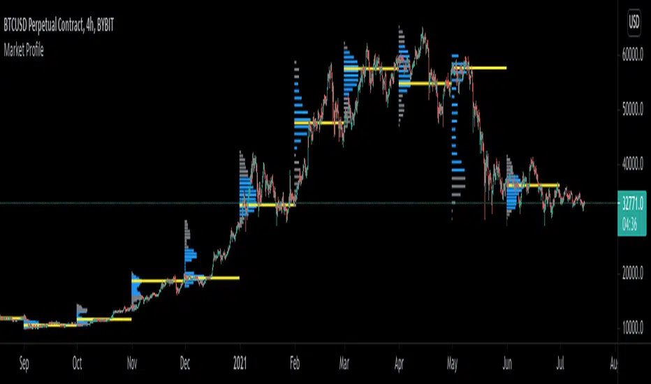 TV user LonesomeTheBlue created the original Market Profile indicator on which this script is based. This version makes minor changes to the automatic timeframes, and to show historic market profiles and points of control.