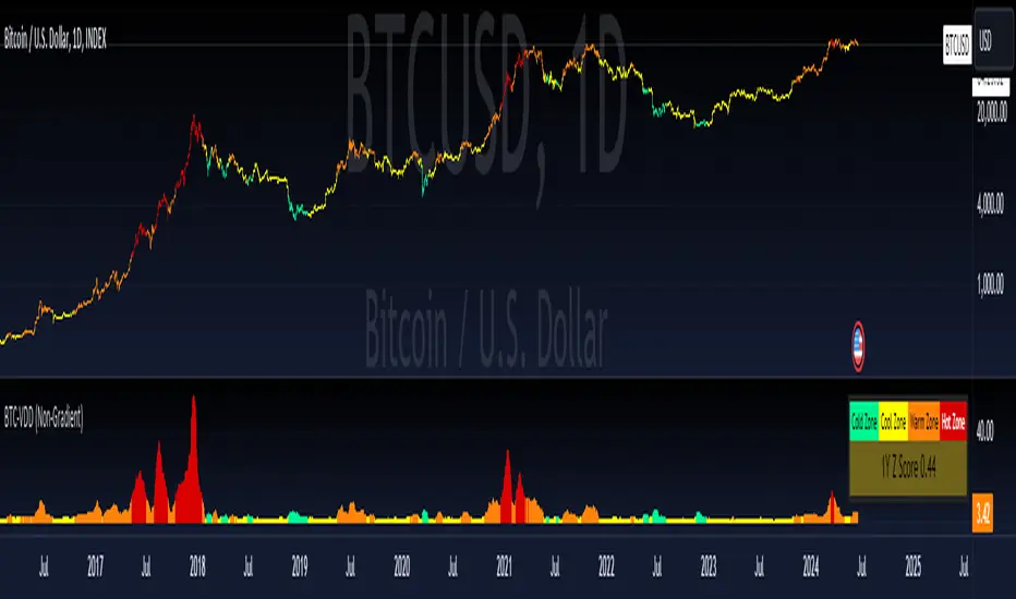 This indicator helps visualize Bitcoin market conditions by categorizing them into four heat zones: Cold, Cool, Warm, and Hot. It uses data from Bitcoin prices and trading volumes to determine these zones.