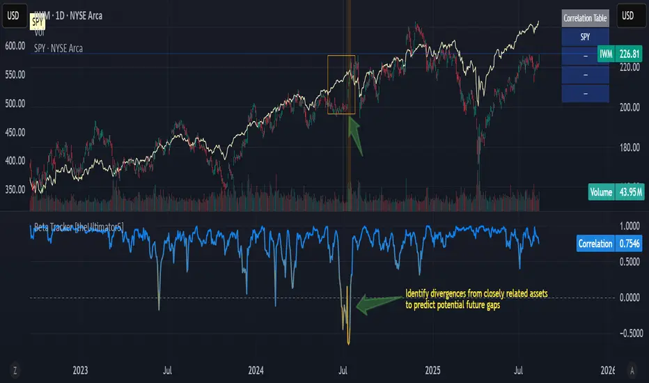 This script calculates the Pearson correlation coefficient between the charted symbol and a dynamic composite of up to four other user-defined tickers. The goal is to track how closely the current asset’s normalized price behavior aligns with, or diverges from, the selected group (or basket)