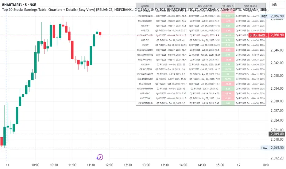 Top 20 Stocks Earnings Table: Quarters + Details (Easy View)