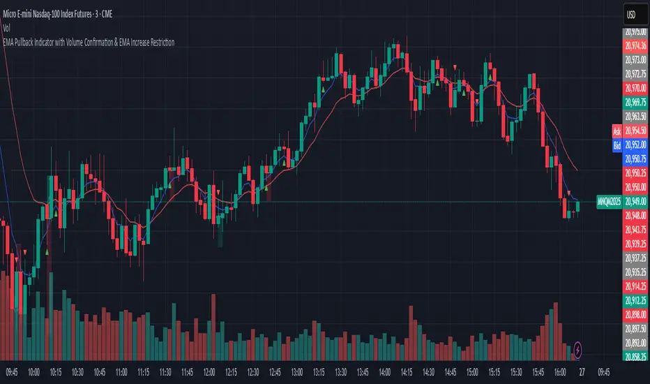 ema pullback with volume analysis as confirmation plus added a trend restriction. Please close at end of candle. Open-source script
