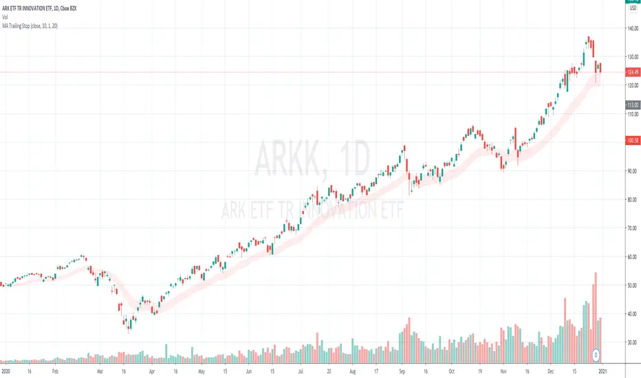A Trailing Stop indicator that uses a multiple of ATR below a SMA/EMA line. Support long positions only.