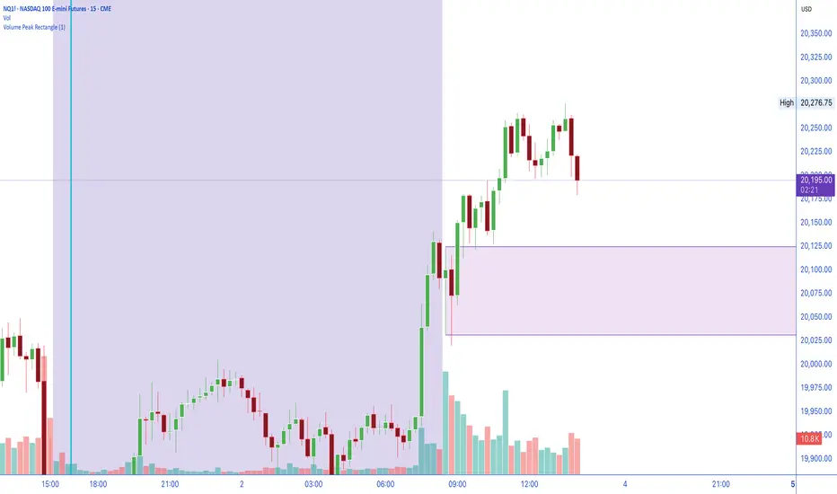 Outlines the 'Latest' Highest Volume Bar. Typically High Volume bars create very good support and resistance levels. This is a draw off the Opening Range Breakout theory, with the idea that high volume candles create very good upper and lower levels of liquidity zones.