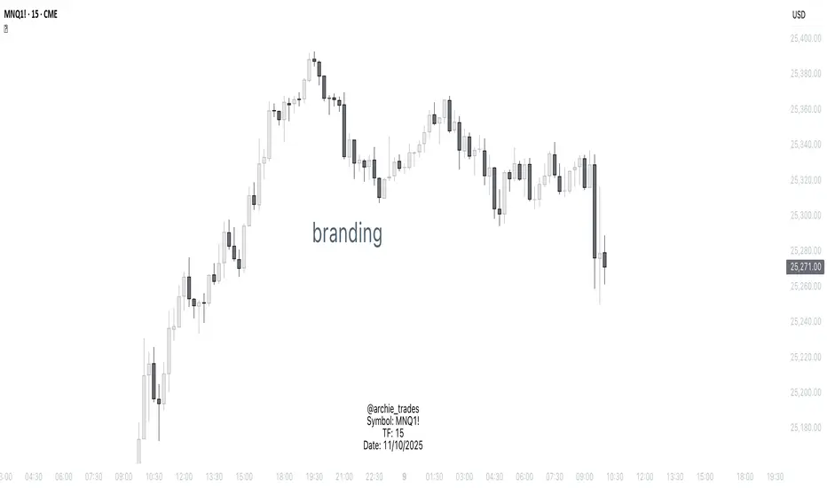 Add a clean, configurable watermark to any chart. This lightweight indicator displays a custom name or brand plus optional symbol, timeframe, and current date in any corner of the chart. Perfect for traders, streamers, analysts, and content creators who want consistent chart branding, fast timestamps, or tidy screenshots.