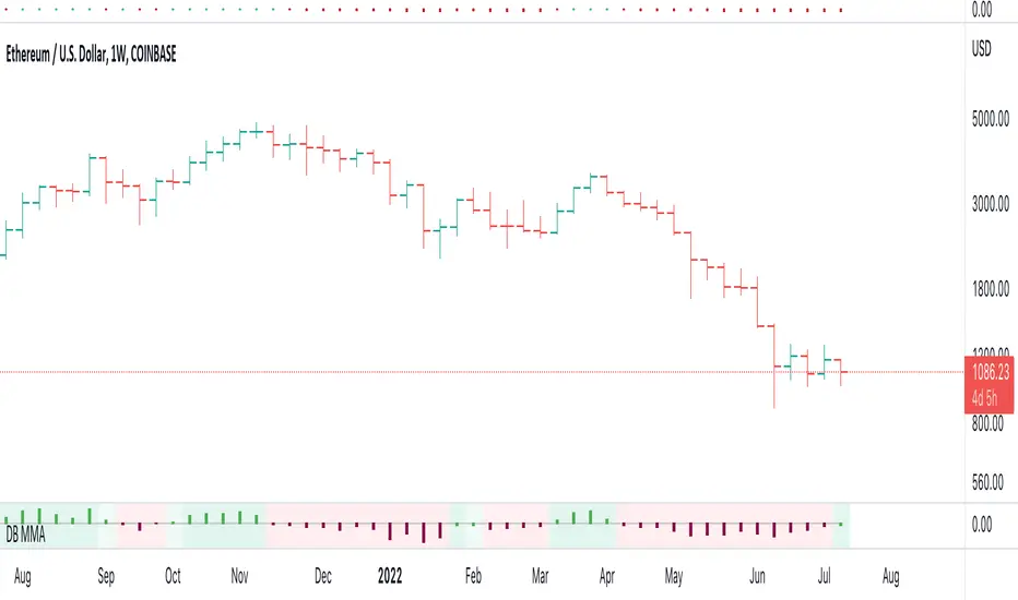 The DB ETHUSD MMA Indicator is explicitly designed for ETH crypto and works on multiple timeframes. However, the weekly+ timeframe is recommended. The indicator is specifically designed to detect trend changes for ETHUSD using a combination of TEMA, T3, EMA, Volume, and Wave A. The indicator is best used two days into the weekly as it repaints in real time. For additional safety, the indicator displays an orange warning light when the weekly timeframe is still very early and possible to repaint. The indicator is designed to live in its pane and will change the background color to indicator buy/sell periods for ETHUSD weekly.