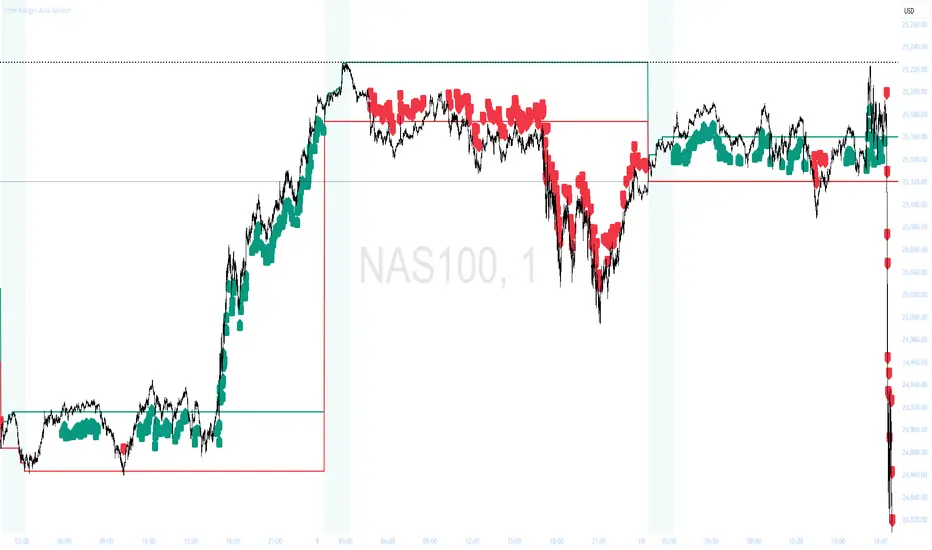 We have some time ranges in the day that as the price go beyond high or low of them, it countinue. Thus the brekout strategies work well. In this indicator Asia the time ranges and the candle closes higher or lower of range with alert signal depicted. We could opt which timeframe to have the candle close and could add ATR filter to the candle for signals.