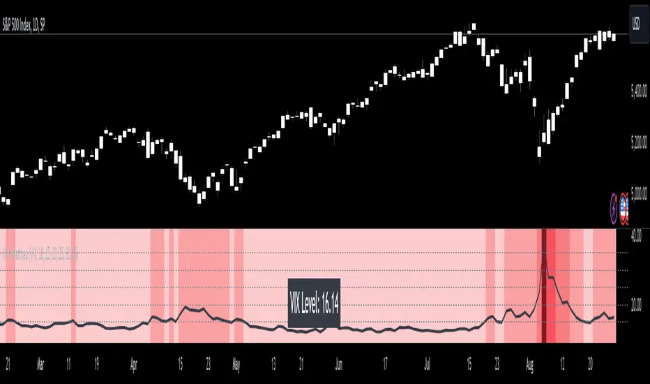 The indicator allows users to set multiple VIX levels: Danger Zone (super low VIX level), and Levels 1 through 5. These levels are represented as horizontal lines on the chart, offering a structured view of different volatility thresholds.