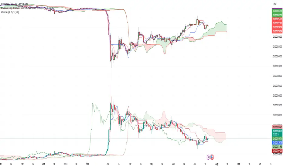 The Ichimoku Cloud is filled with semi-transparent colors to clearly distinguish between bullish and bearish conditions even in its reversed state.