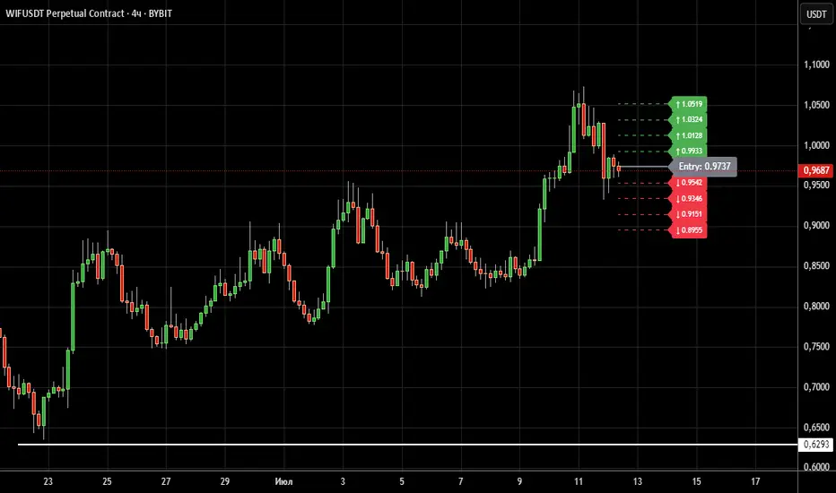 This Pine Script v6 indicator creates a dynamic price grid based on a user-defined entry price and ATR for selected instruments (SOLUSDT, XRPUSDT, DOGEUSDT, PEPEUSDT, WIFUSDT).