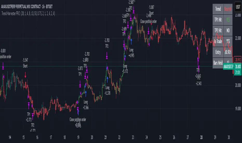 Trend Harvester PRO is a fully systematic trend-following strategy built for cryptocurrency markets on intraday timeframes — particularly optimized for the 1-hour chart. The script combines ZLEMA-based trend tracking, momentum confirmation, and a volatility-aware filter to detect high-probability directional moves with clarity and precision.