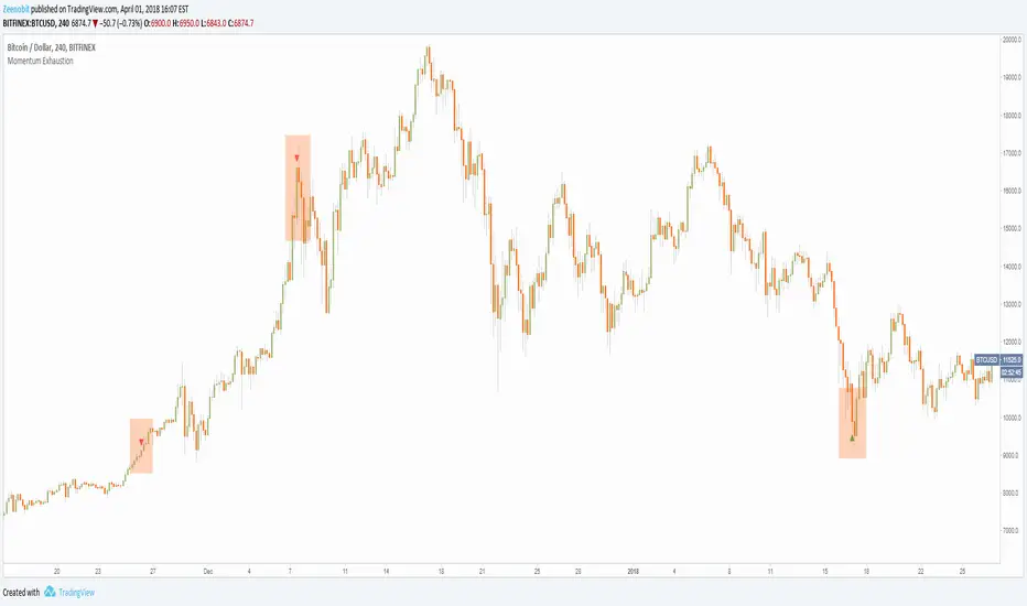 This is a very simple indicator for quickly spotting points of momentum exhaustion and potential trend reversal. It is NOT a Buy or Sell signal. Instead, it tries to isolate periods of maximum risk and maximum opportunity.