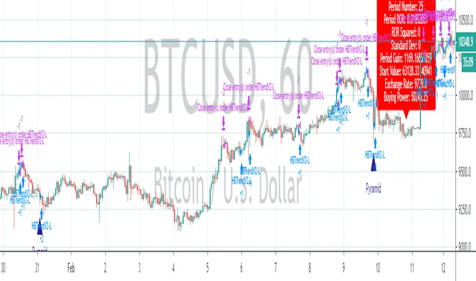 In addition to pyramiding this script employs DCA which enables users to experiment with loss recovery techniques. This is another advanced feature which can increase the order size on new trades in response to stopped out or winning streak trades. The script keeps track of debt incurred from losing trades. When the debt is recovered the order size returns to the base amount specified in the TV properties tab. The inputs for this feature include a limiter to prevent your account from depleting capital during runaway markets. The main difference between DCA and pyramids is that this implementation of DCA applies to new trades while pyramids affect open positions. DCA is a popular feature in crypto trading but can leave you with large “bags” if your not careful. In other markets, especially margin trading, you’ll need a well funded account and much experience.