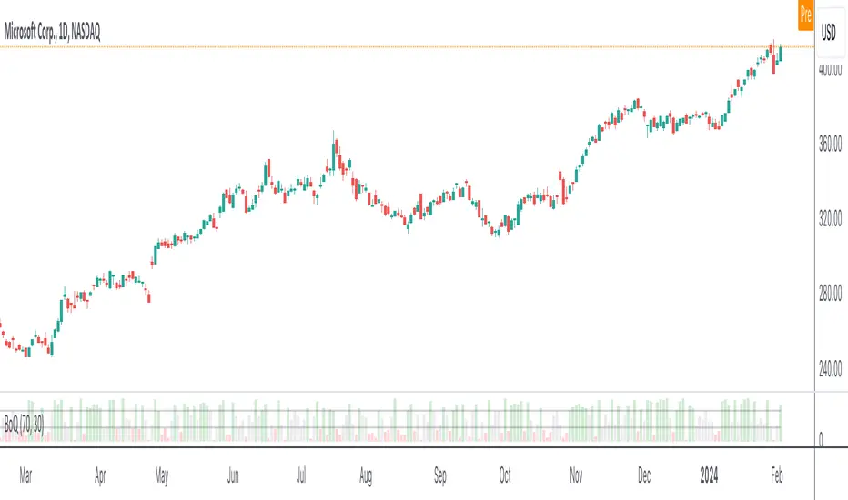 - For a bullish breakout signal, if the close is nestled within the top range of the bar, the BoQ histogram displays a green bar for that day, signifying a robust breakout candle.