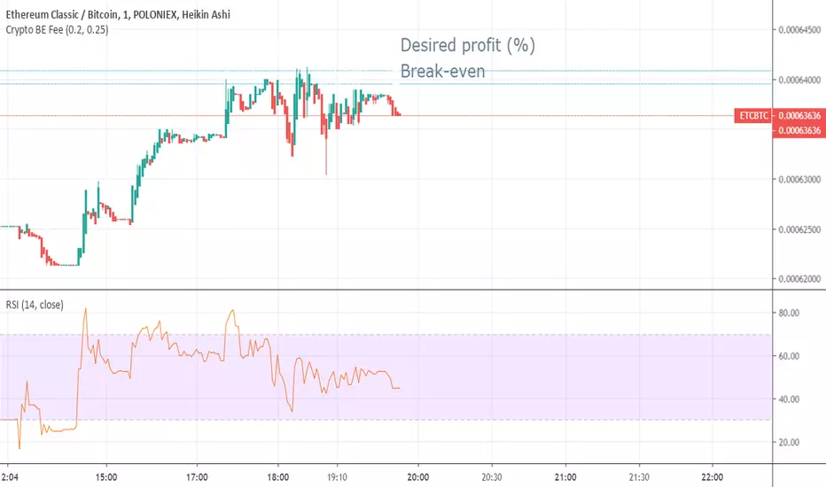 When I started trading cryptocurrency, I lost money because I didn't take the fees enough into account. Therefore I created my own indicator to quicqly see the break-even selling price of the selling price if I want a predifined profit level.