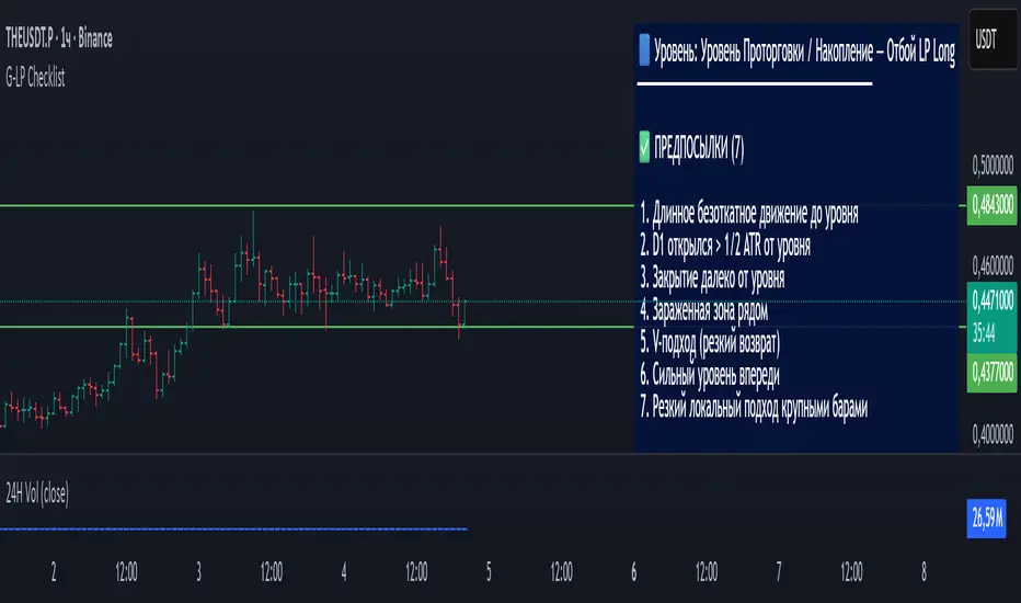 Скрипт для работы с отбойными (ложно-пробойными) сетапами по логике уровней Герчика: чек-лист на графике, фиксированный дневной ATR, расчёт ТВХ/SL/TP и простой калькулятор позиции от риска. Значения ATR фиксируются на D1, поэтому SL/TP не плавают при смене таймфреймов. Интерфейс (входы и панель) на русском.