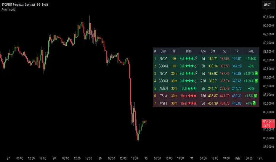 Augury Grid consolidates multi-symbol, multi-timeframe scanning into a single organized display. The quality scoring system helps prioritize signals, the confluence detection identifies cross-timeframe agreement, and the automatic stop loss tracking keeps the grid focused on active opportunities. Whether scanning crypto majors, forex pairs, or stock indices, the scanner provides a structured approach to identifying and ranking potential setups across your watchlist.