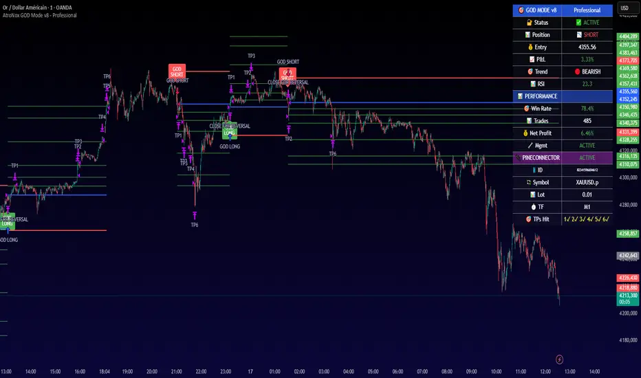 AtroNox GOD Mode v8 is an advanced trading strategy that combines dynamic Bollinger Band analysis with proprietary trend detection algorithms. The strategy features six-tier take profit management, multiple filtering systems, and optional integration with PineConnector for automated trading through MetaTrader platforms.