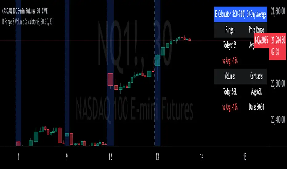 This indicator tracks and analyzes the Initial Balance (IB) period (first 30 minutes of trading from 8:30-9:00 AM Chicago time) by measuring both price range and trading volume. It compares today's values against a 30-day average, providing essential context for day traders and scalpers.