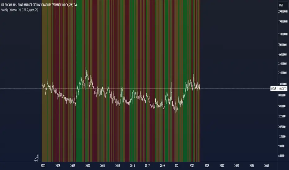 The indicator visualizes these signals by changing the background color: green for growth, red for decline, and yellow for neutral or undefined conditions.