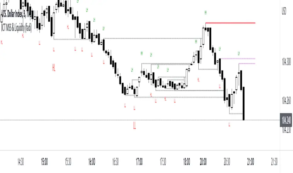 ICT MSS & Liquidity indicator calculates two pivot points and the most likely location of the liquidity. The two pivot points are called Major and Internal. Both can be configured and adjusted separately to suit the instrument being traded and how the trader prefers to trade.