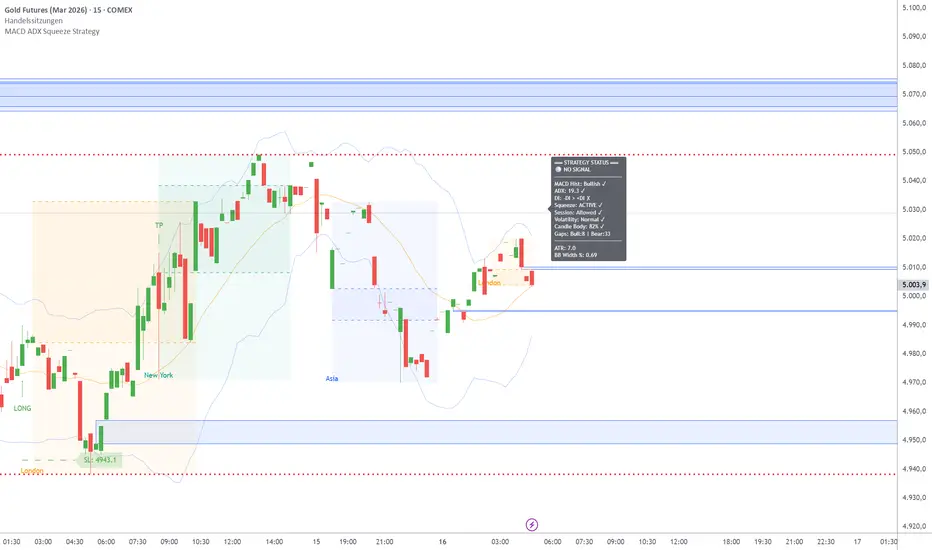 The MACD ADX Squeeze Bot is a trend-based breakout strategy that combines momentum, trend strength, and volatility compression to identify high-probability entries.