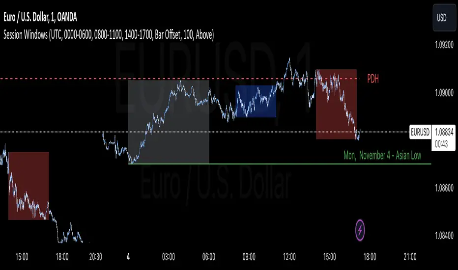 The Session Windows indicator visualizes predefined trading sessions on the chart, highlighting key price ranges with customizable background colors and labels. Designed to track session-specific high and low levels, this tool provides visual guidance for analyzing market behavior across different trading windows. It includes three customizable sessions—Asian, Window 1, and Window 2—that can be toggled on or off.