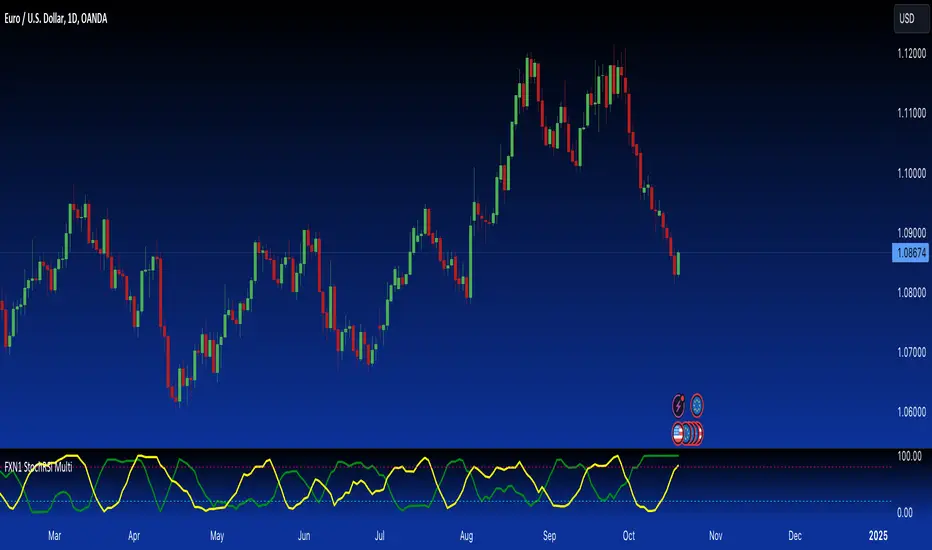 The "FXN1 StochRSI Multi" indicator offers a unique and practical approach for traders who want to enhance their trading analysis by incorporating the Stochastic RSI of multiple assets. With customizable settings, overbought/oversold zones, and a user-friendly design, this tool provides everything traders need to perform cross-market technical analysis. Whether you are trading forex, commodities, or indices, this script is a valuable addition to your trading toolbox.