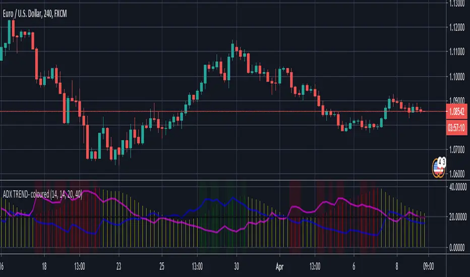 DMI and ADX plotted on an indicator. ADX histogram is colored when above value of 20 and rising when aligned with trend direction as defined by DMI criteria. (Green=Bullish & trending / Red=Bearish & trending)